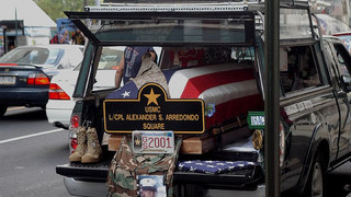 AMY GOODMAN: Well, Carlos and Mélida, we want to thank you for being with us, and I’m so sorry we’re speaking to you on such a painful day. Thank you for being there, and, Carlos, as usual, for your heroism. When Carlos learned he lost his son when the Marines came to his door, he set his van on fire, and then he started his journey around the country for peace. And as you heard, Carlos and Mélida lost their son Brian, their second son, last year to suicide.