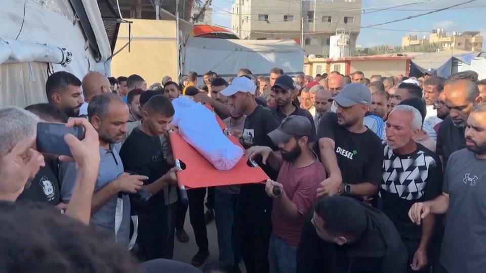 Israel continues to bombard Gaza, killing 51 Palestinians in 24 hours. Two missiles struck al-Falah School in Gaza City, which had been converted into a shelter for hundreds of displaced people. Turkish broadcaster TRT confirmed that a Palestinian freelance photographer, Yahya Barzaq, was killed by Israel in Deir al-Balah in central Gaza yesterday. Palestinians gathered at Al-Aqsa Hospital in Deir al-Balah mourning their loved ones killed in Israeli strikes. Here’s Atef Abu Jarad, a displaced Palestinian man from Beit Lahia.