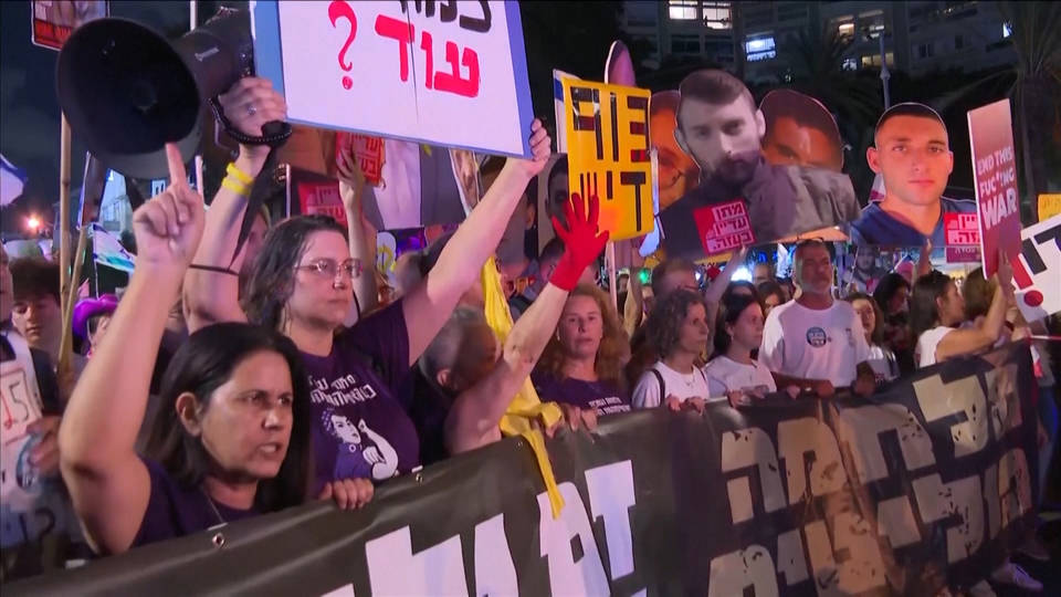 In Israel, parents of soldiers marched alongside the relatives of hostages on Tuesday in Tel Aviv, calling for an end to the war on Gaza. The protesters marched with a banner urging U.S President Donald Trump to “Make It Happen.” Here’s Eilat Feller Maimon, the mother of an Israeli soldier.