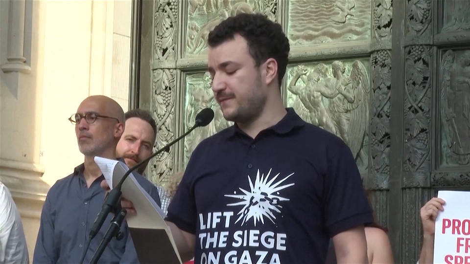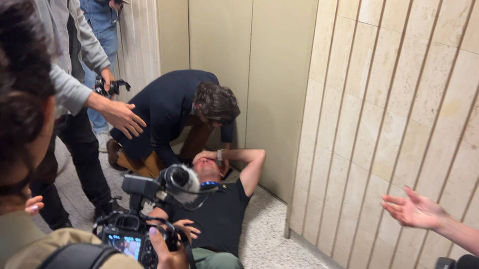 In New York, a journalist was hospitalized after masked federal agents assaulted a group of reporters documenting ICE arrests outside immigration court at 26 Federal Plaza in Manhattan. Video footage of Tuesday’s attack shows amNewYork’s journalist Dean Moses attempting to enter an elevator where masked agents had followed two women, when he was shoved out, with an agent shouting, “Get out of the f**king elevator.” Olga Fedorova, who freelances for the Associated Press, was pushed, knocking her down, as well as Vural Elibol of the Turkish news agency Anadolu, who seriously injured his head after he hit the floor. DHS spokesperson Tricia McLaughlin defended the agents’ actions, claiming the reporters had “obstructed operations.”