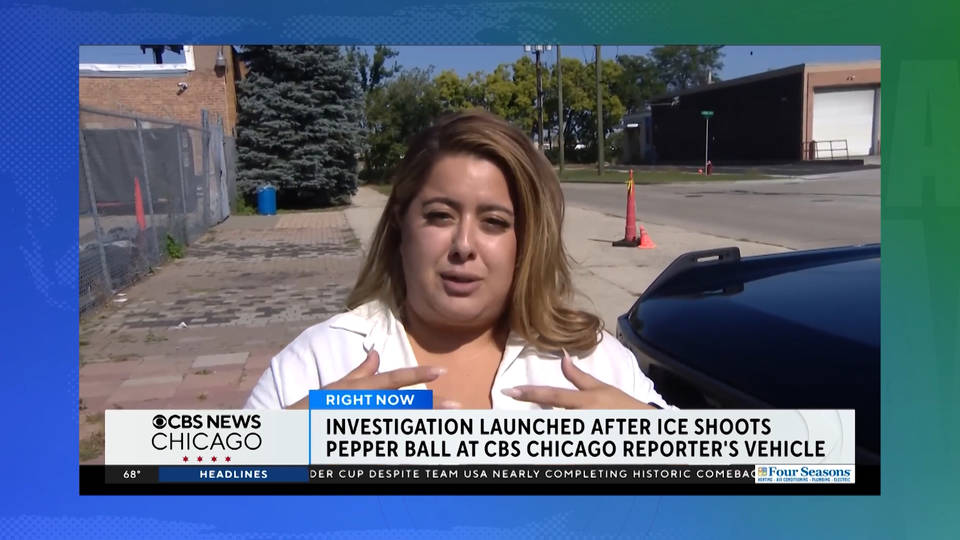The Trump administration is escalating its attacks on journalists documenting mass immigration raids nationwide. In Chicago, an investigation was launched after a local journalist was assaulted by federal immigration agents while covering protests outside an ICE jail in Broadview Sunday. A masked agent shot a pepper ball at CBS Chicago reporter Asal Rezaei. She described the attack on social media, saying, “An ICE agent took a direct shot at my car today. Absolutely unprovoked. My window was open and chemicals went all over my face. Been puking for two hours.”