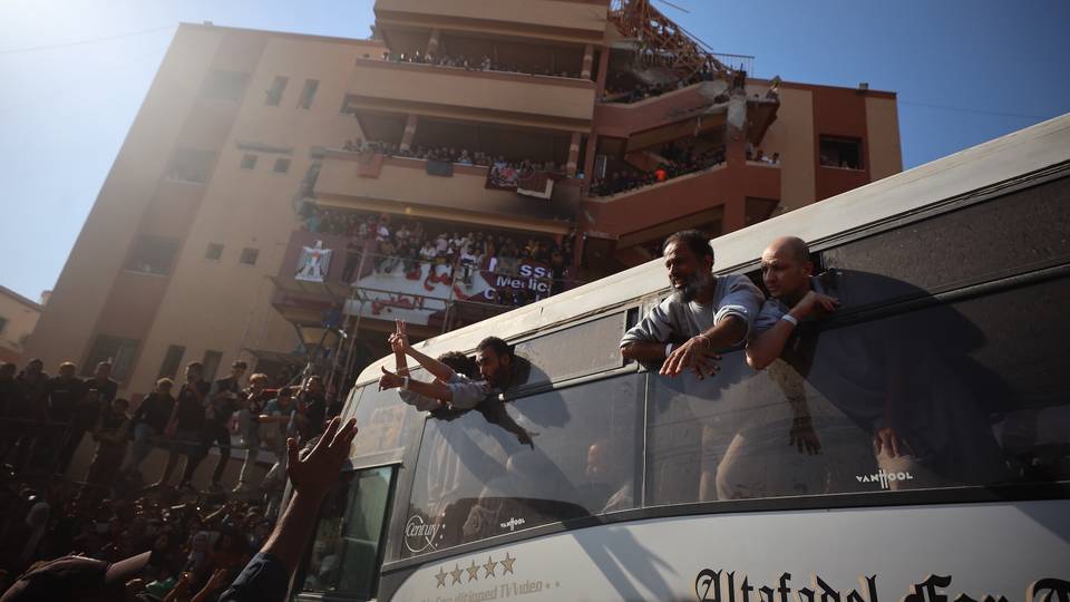 On Monday, thousands of Palestinians gathered in Khan Younis and the West Bank to celebrate the return of nearly 2,000 Palestinian prisoners and detainees freed as part of the ceasefire deal. Many of those released had been jailed by Israel without trial. They showed signs of starvation, medical neglect and torture. This is 48-year-old Palestinian Majed Abid, who was detained nearly two years ago.