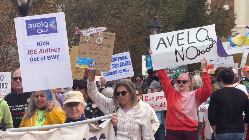 In Maryland, hundreds of activists and Democratic state legislators rallied in Annapolis on Saturday, calling on Governor Wes Moore to end the state’s contract with Avelo Airlines, a private airline carrying out deportation flights. Avelo has cut several routes amid growing backlash and a nationwide boycott after it signed a $150 million contract with ICE earlier this year. Here’s Maryland state Senator Clarence Lam.