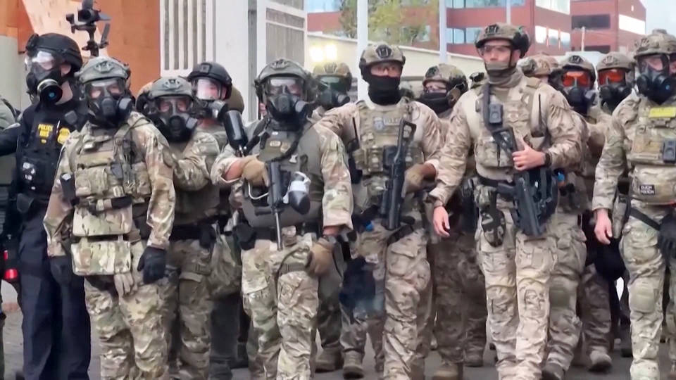 The Trump administration is asking an appeals court for authorization to send troops from Texas and California to Oregon, after a federal judge over the weekend blocked the deployment of National Guard troops. In Portland, an elderly couple protesting against ICE on Saturday says they were knocked over by federal agents. Laurie Eckman told The Oregonian, “With no warning the feds charged into us, knocked us down and sprayed us. I was hit in the head with a projectile.” Oregon Senator Jeff Merkley said, “Trump’s troops are deliberately attacking peaceful protesters to incite violence. The goal is to generate riots to justify the expansion of authoritarian measures and to strengthen the case for the troop deployments.”