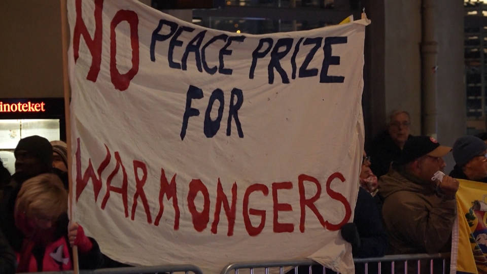 In Oslo, Norway, the 2025 Nobel Peace Prize was awarded to the right-wing Venezuelan opposition leader María Corina Machado, but she did not attend the ceremony. Her daughter accepted the prize on her behalf. Ahead of the ceremony, Machado said she was heading to Oslo but would not arrive in time for the event. Machado has been in hiding for the past year. On Tuesday night, hundreds of protesters marched in Oslo to condemn the selection of Machado, who has supported Trump’s threats against the Venezuelan government. In October, she dedicated the peace prize to President Trump.